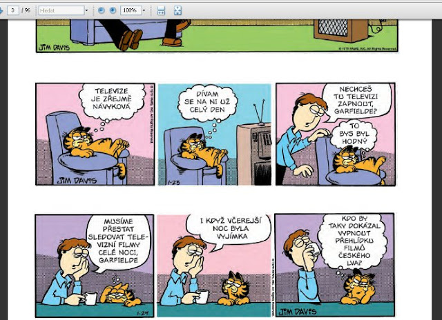 Ve formátu PDF vypadá téměř stejně jako tištěný. Jen pozor při stažení do čtečky – u osmipalcových a menších je čtení PDF dokumentů trochu méně pohodlné. Samozřejmě – v černobílé čtečce bude i Garfield černobílý.